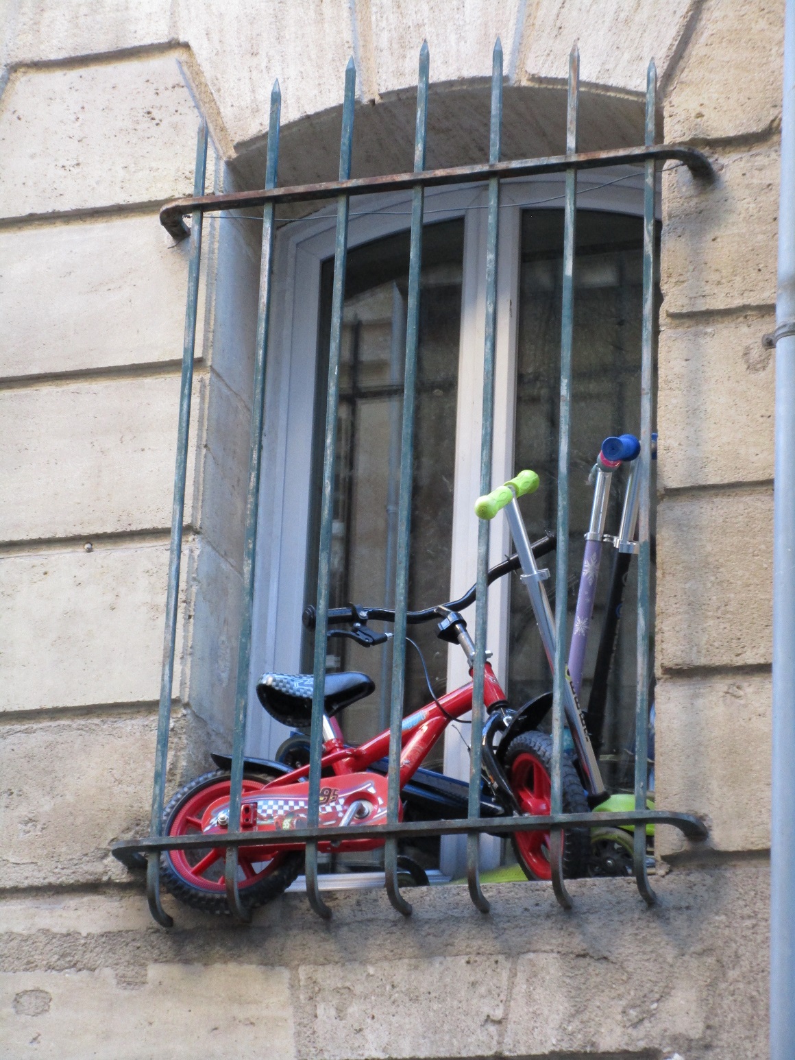 As most people who live in the city live in apartments, they play outdoors in the parks, most of the time. When you don't have anywhere inside (or outside, for that matter) to store your stuff, this is what you do. The windows open in, fortunately.