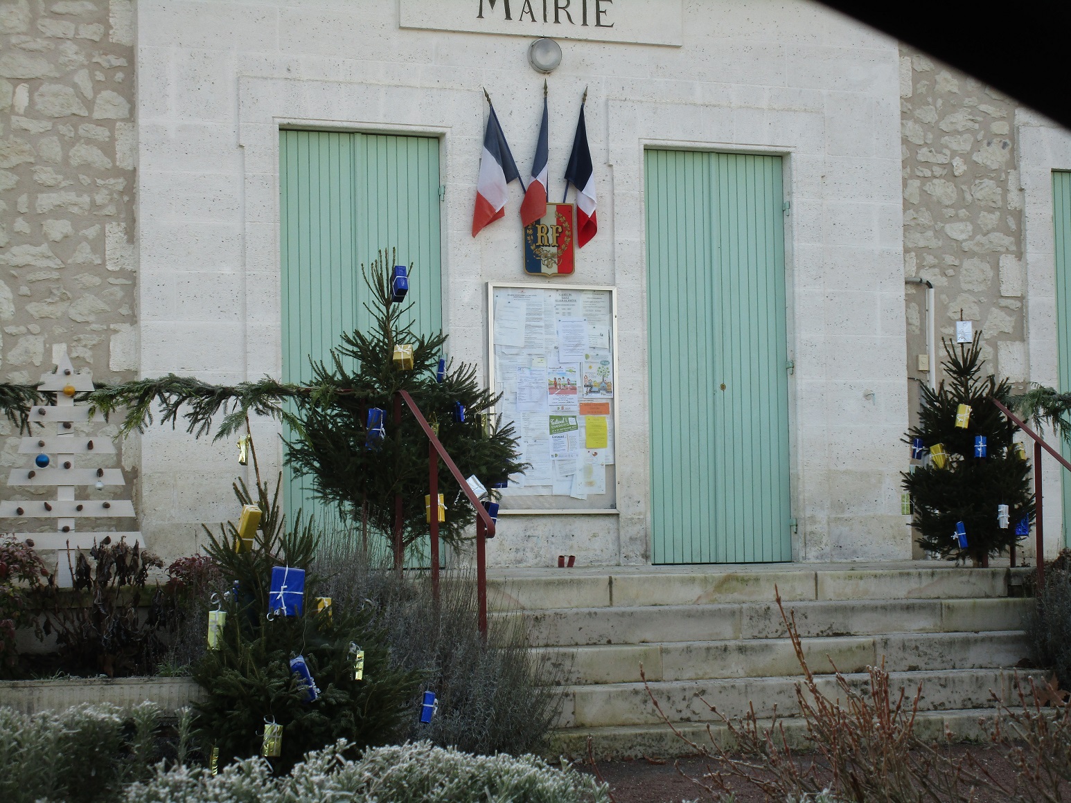 The Mairie in the next town had a bit of money for colorful deco's, but the trees are small and a bit mean looking. Those trees would cost about 25 euros in the market, though. Not cheap!