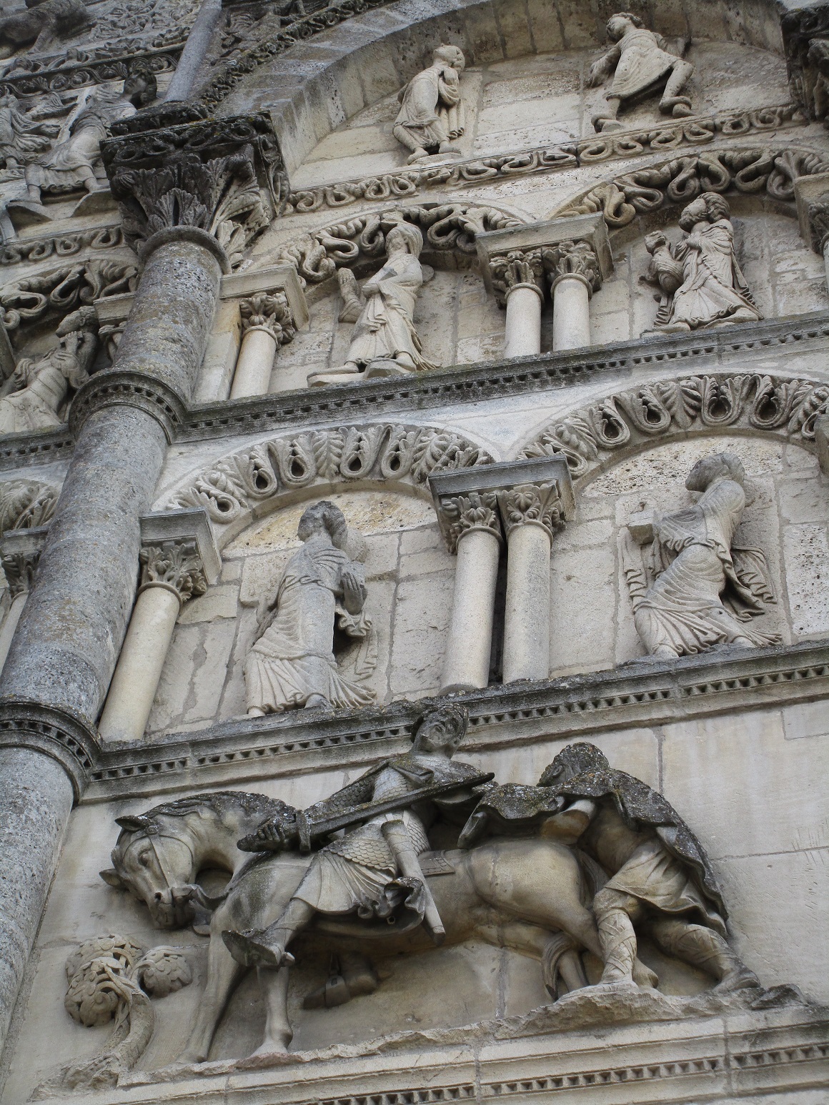 This is one of several imposing cathedrals in Angouleme. We walked up the left hand side of it and around the back, making more discoveries along the way. We had parked waaay down the other side of the Centre Ville, and had much walking to return there. Not in any hurry and enjoying the exercise despite the cold, we enjoyed the sunshine while it was there, and the lack of people. Plenty of others appeared the further towards the center of town we walked, similarly enjoying the sunshine, though rugged up warmly.